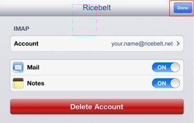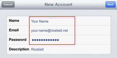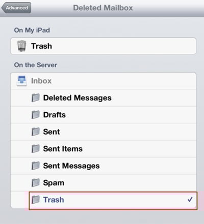You must open the account in Mail one time, so it will load the folders. Then go back to Mail, Contacts, Calendars settings. Select the Ricebelt account you just created. Tap Advanced.