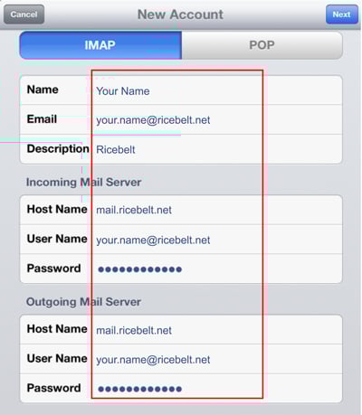 Tap IMAP. Fill in the incoming and outgoing mail server settings: both are mail.server.net. Nothing is optional even if it tells you it is. Both usernames are your full email address. Tap Next.