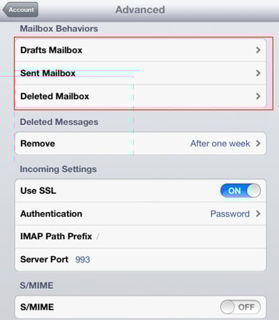 For each of the folders under Mailbox behaviors: Tap the Mailbox, and select the proper folder On the Server.