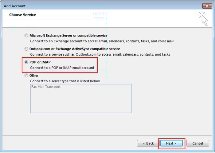 - Select POP or IMAP and click Next.
