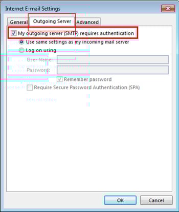 - Select the Outgoing Server tab. Make sure My outgoing server (SMTP) requires authentication is checked.