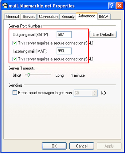 On the Advanced tab, check both boxes that say “This server requires a secure connection (SSL).” Also make sure the ports match: Outgoing is 587 and Incoming is 993.