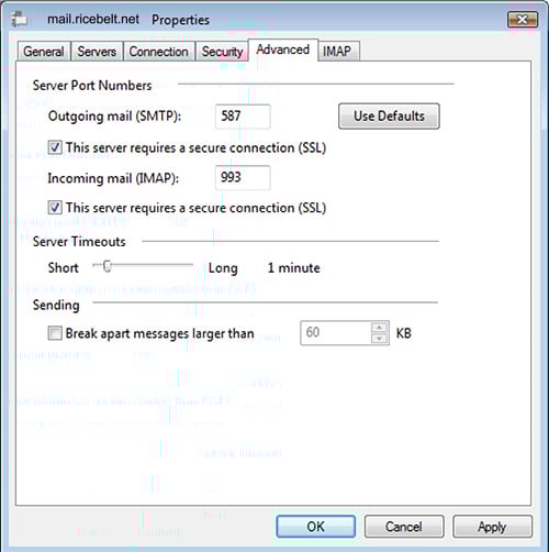 - On the Advanced Tab, set the port numbers as outlined below. Also make sure This server requires a secure connection (SSL) is enabled.