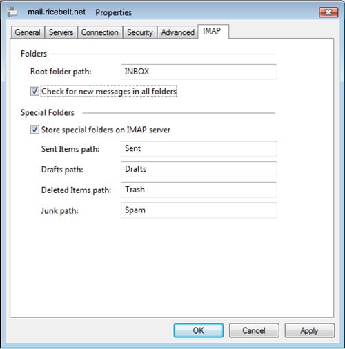 - On the IMAP tab, set the Root folder path to be INBOX (all capitals). You may also need to rename the Special Folders.