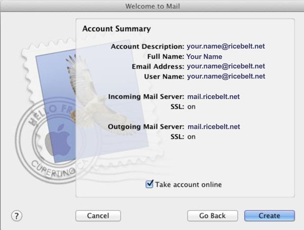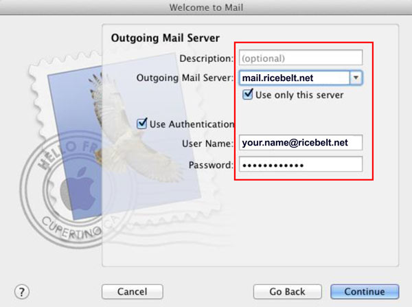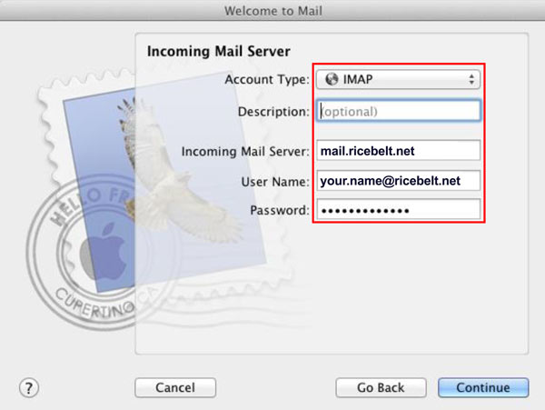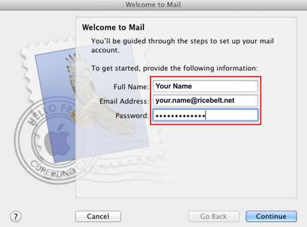 - This is the new account setting when you first set up Mac Mail. Fill in the boxes and click Continue.