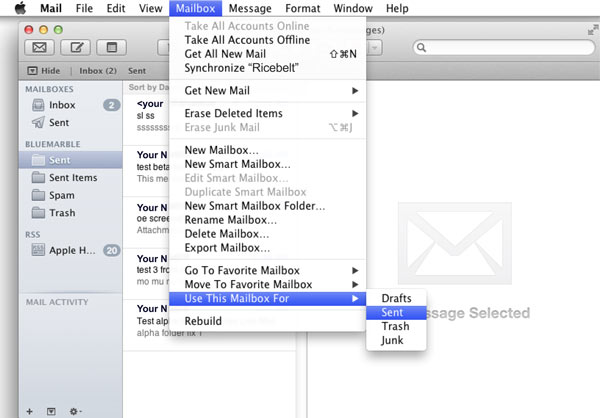 - To fix the Sent and Trash folders, you need to highlight the folder on the mailbox pane, select the mailbox menu, and go to Use This Mailbox For and select the appropriate location.